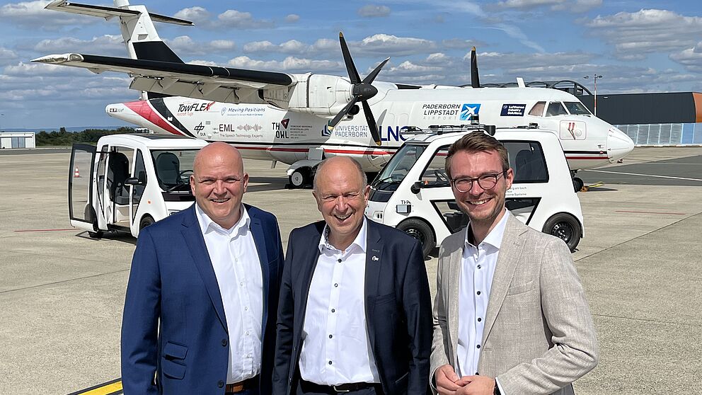 Photo (NeMo e.V.): Start of the automated test drives by Neue Mobilität Paderborn (from left): Airport Managing Director Roland Hüser, Chairman of the Airport Supervisory Board District Administrator Christoph Rüther and NeMo Managing Director Jonathan Behm.