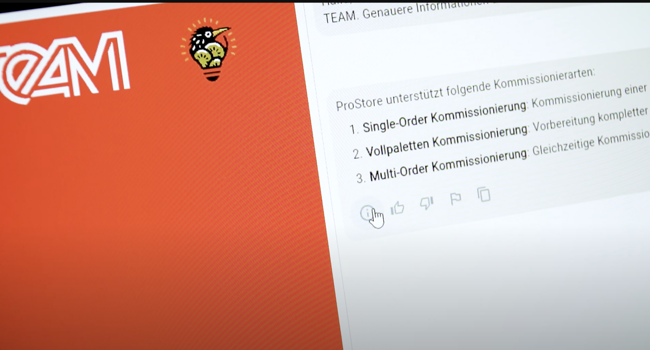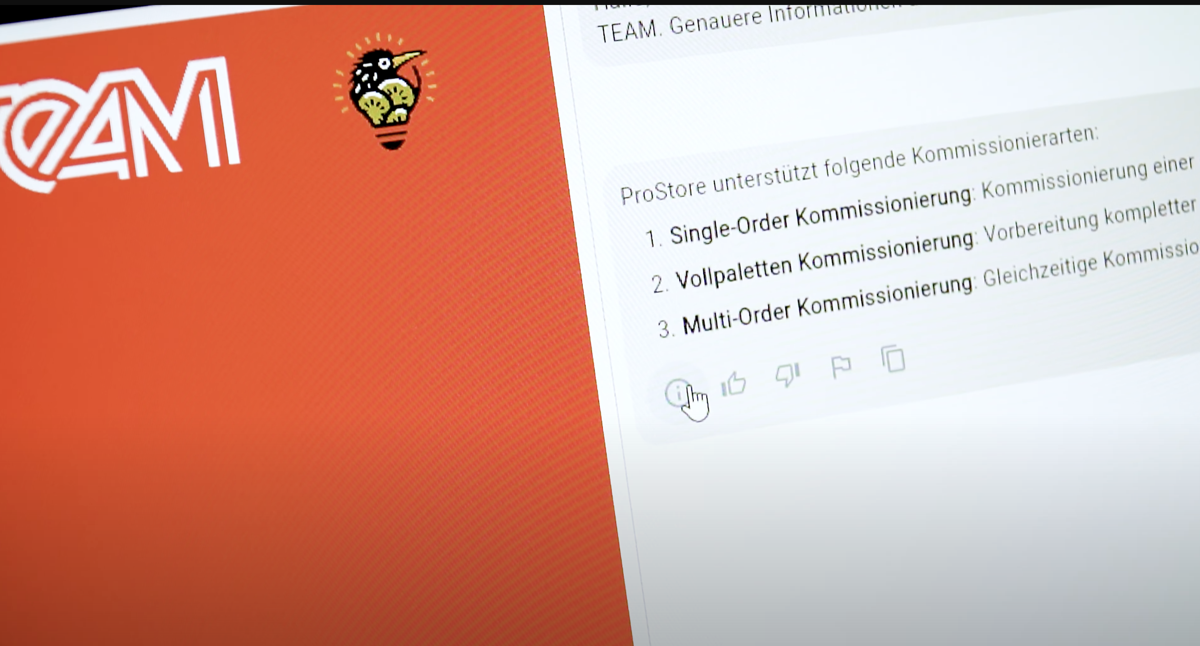 Die Entwicklung der KI zur Wissenstransformation (kurz: KIWI) begann mit der Identifikation relevanter Wissensdokumente (z. B. Pflichtenhefte, Handbücher, QM-Dokumente). Technisch entschieden sich die Partner, das System nach der RAG-Architektur (Retrieval-Augmented Generation) zu konzipieren und die Wissensquellen mithilfe definierter Metadaten strukturiert einzulesen. Die Oberfläche von KIWI wurde so aufgebaut wie ein Chat. Mit der Unterstützung von erfahrenen Mitarbeitenden wurden dann typische ProStore®-Fragen erstellt, die KIWI anhand der eingelesenen Wissensquellen korrekt beantworten können musste. Die Antworten wurden dann von Expert*innen mit Schulnoten bewertet. Auf Basis dieser Rückmeldungen wurden in einem iterativen Entwicklungsprozess gezielt technische Verbesserungen umgesetzt (z. B. Auswahl des LLMs, Embedding-Modell, Filteroptionen, Chathistorie) und dadurch die KI schrittweise verbessert. Am Ende des Prozesses konnte die durchschnittliche Antwortqualität von „ausreichend“ auf „sehr gut“ gesteigert werden.