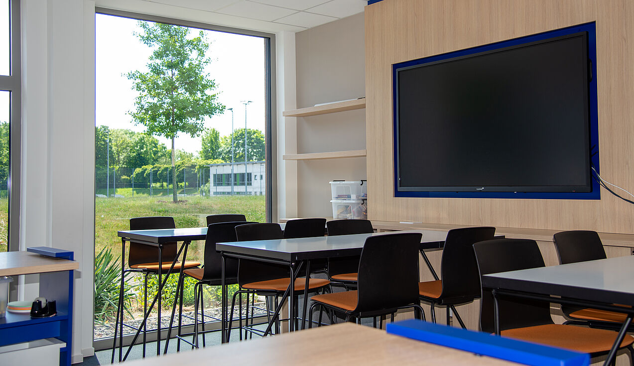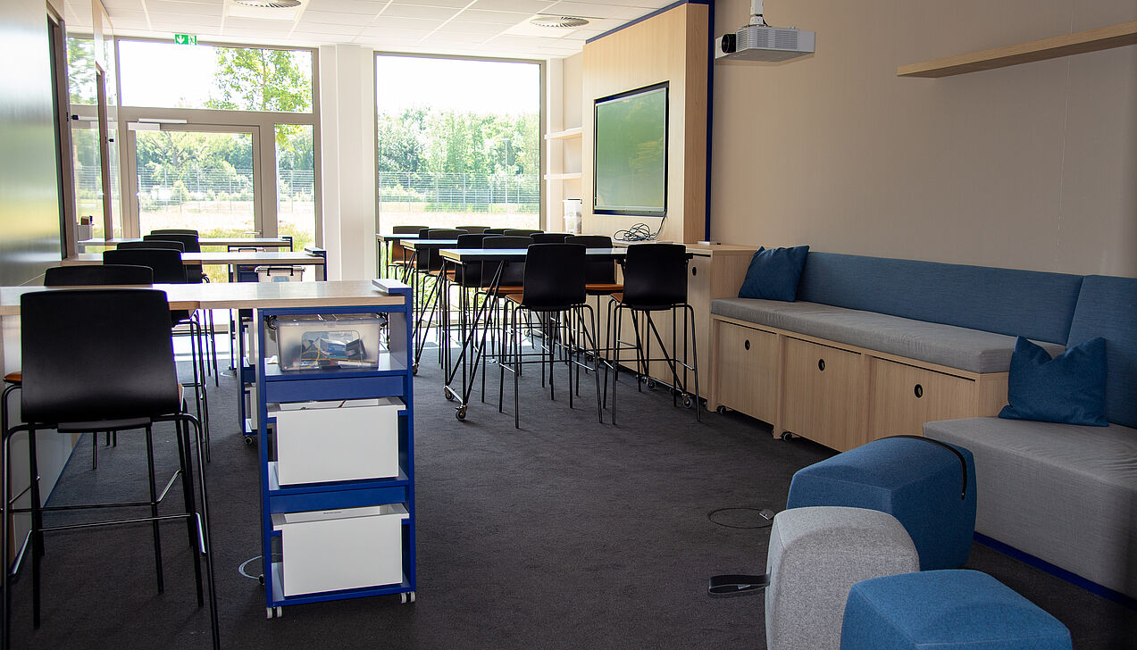 Der Raum verfügt über fünf hohe Tische und eine kleine Sitzecke. An Hilfsmitteln steht ein Flipchart zur Verfügung. Die maximale Raumkapazität beträgt 18 Personen. Der Raum hat eine Fläche von ca. 53m² und eignet sich gut für kreatives Arbeiten im kleineren Kreis. Der Zugang zur Medientechnik ist über Bodentanks möglich (Strom- und Netzwerkanschlüsse).