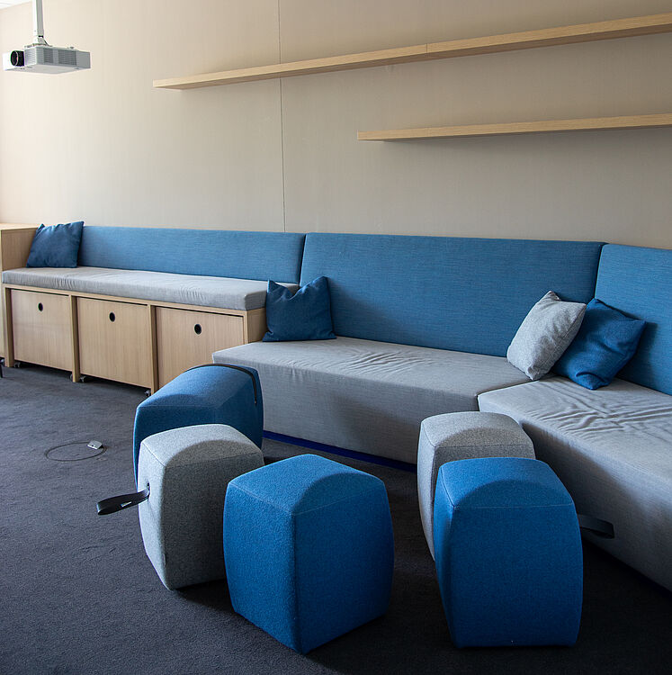 Stilvoller Raum im Erdgeschoss der Zukunftsmeile 2 mit Lounge-Charakter und Tageslicht.