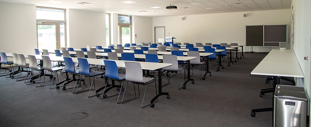 Der Raum hat eine Fläche von ca. 191 m² und eignet sich besonders gut für Großveranstaltungen. Die maximale Raumkapazität beträgt 72 Personen. Der Tagungsraum verfügt über Stühle und Tische ausreichend für 72 Personen. An Hilfsmitteln stehen ein Flipchart und zwei Metaplanwände zur Verfügung. Die Trennwände ermöglichen eine freie Raumgestaltung. Ein fest installierter Beamer und ein Rednerpult für Vorträge gehören ebenfalls zur Ausstattung. Der Zugang zur Medientechnik ist über Bodentanks möglich (Strom- und Netzwerkanschlüsse).